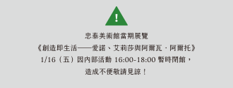 ※ 本展覽另有「主題導覽」場次(12/10、12/31、1/7、2/4、2/25),邀請基金會前同仁或資深同仁,親身分享展覽背後執行過程精彩事蹟及實戰經驗、觀點交流。
