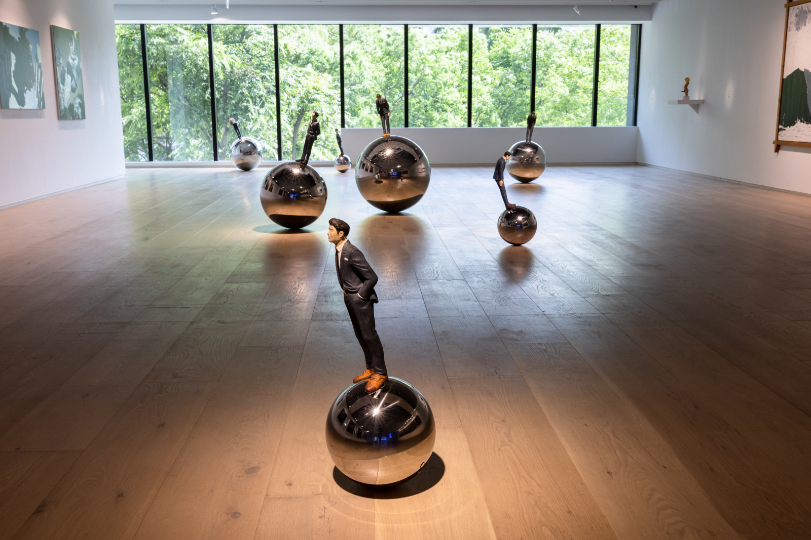 The Fit In Series I & II comprise hand-finished human figures from rough woodcarvings (rudimentary forms without details) made with plastic molds and duplicated by machine. This approach allows these human figures to continuously grow in number, which renders them as similar as discrete. Differing in method and purpose from the usual sculptural reproduction, this approach is for the artist not so much reproduction as imitation, hence closer to the concept of “fit in.” Created from subjective impression/imagination, this group of human figures speaks for itself. In addition to highlighting a certain kind of order or structure, these human figures encourage the viewers to explore the value of individuals in the “fit-in” process. The Fit In Series I & II employ stainless steel ball devices whose spontaneous swaying motion conveys an impression of instability. Both the visual layouts and the locations of the works change over time. Such an arrangement ergo immerses the viewers in a volatile situation of swinging in which they are seeking a place where they could settle down.